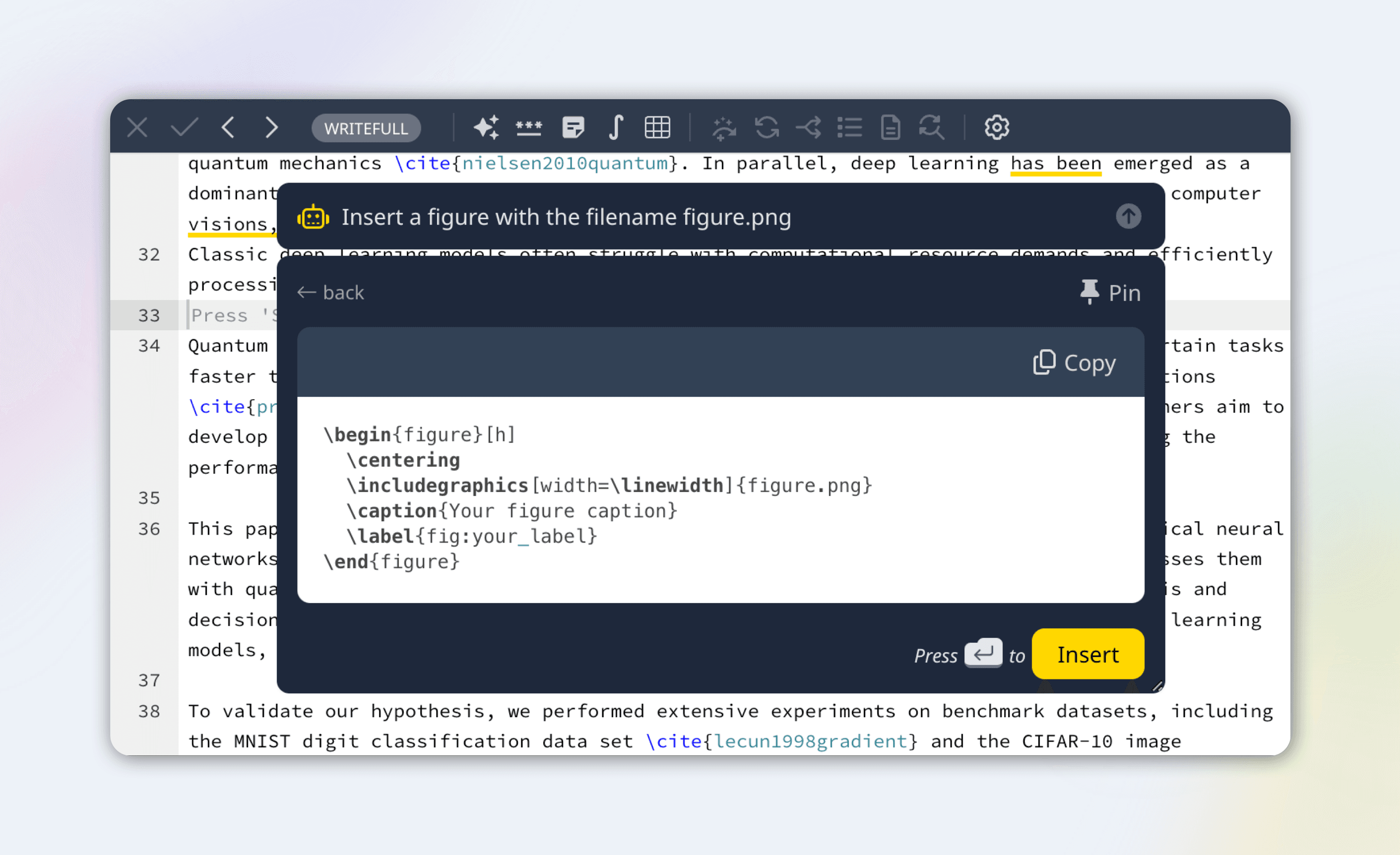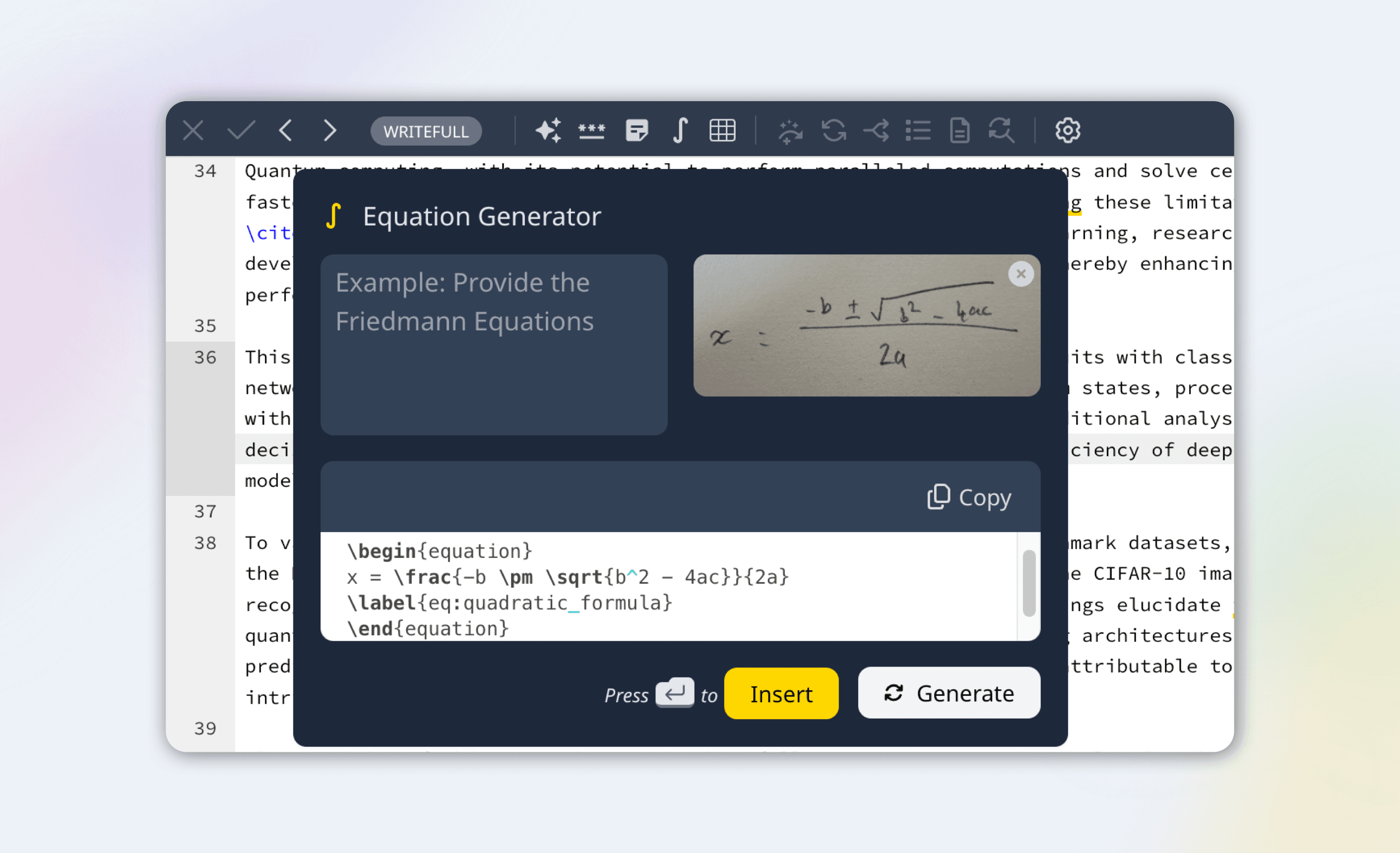 Say goodbye to manual coding for tables and equations. Simply enter a prompt or upload an image, and Writefull gives you the LaTeX code.