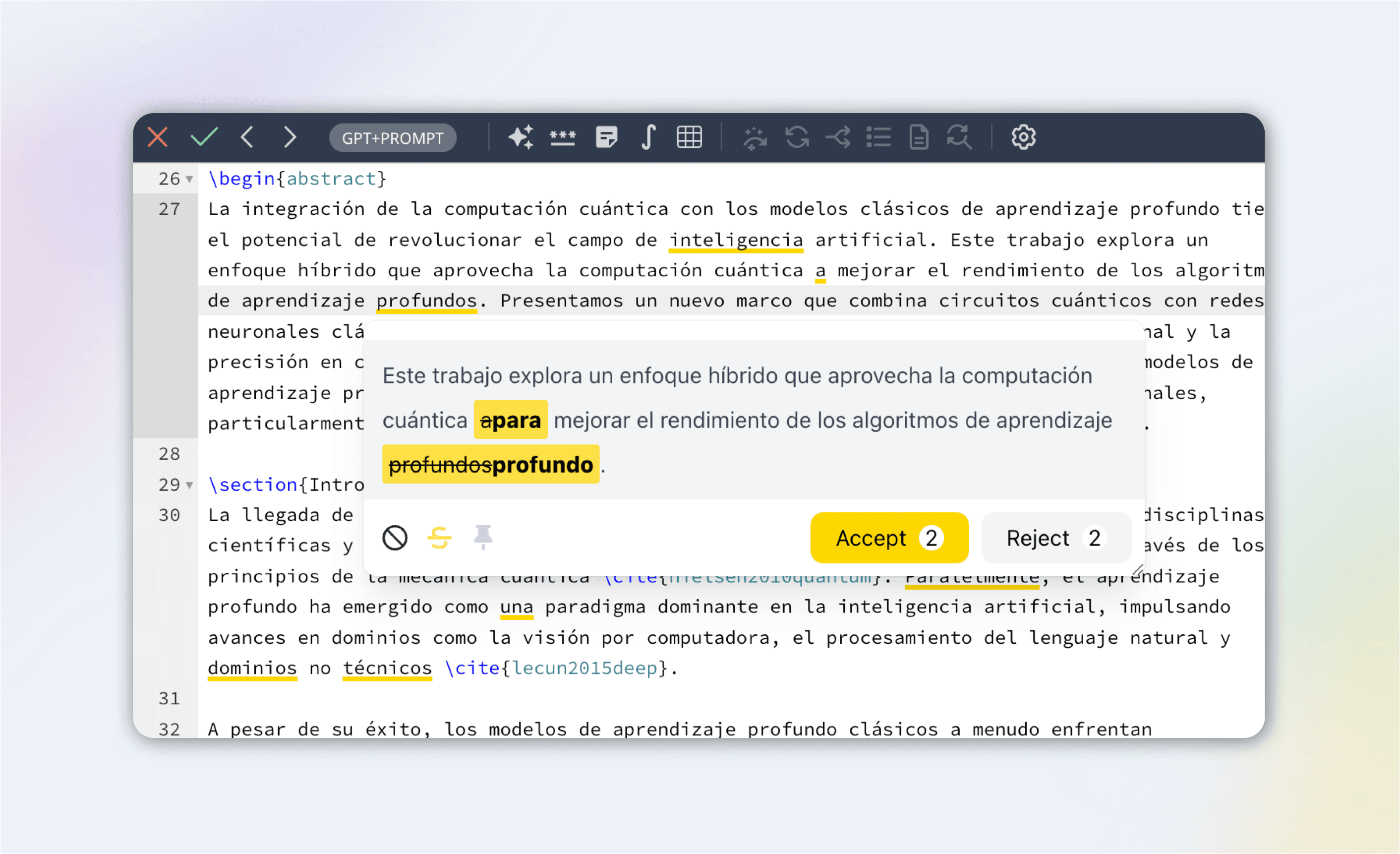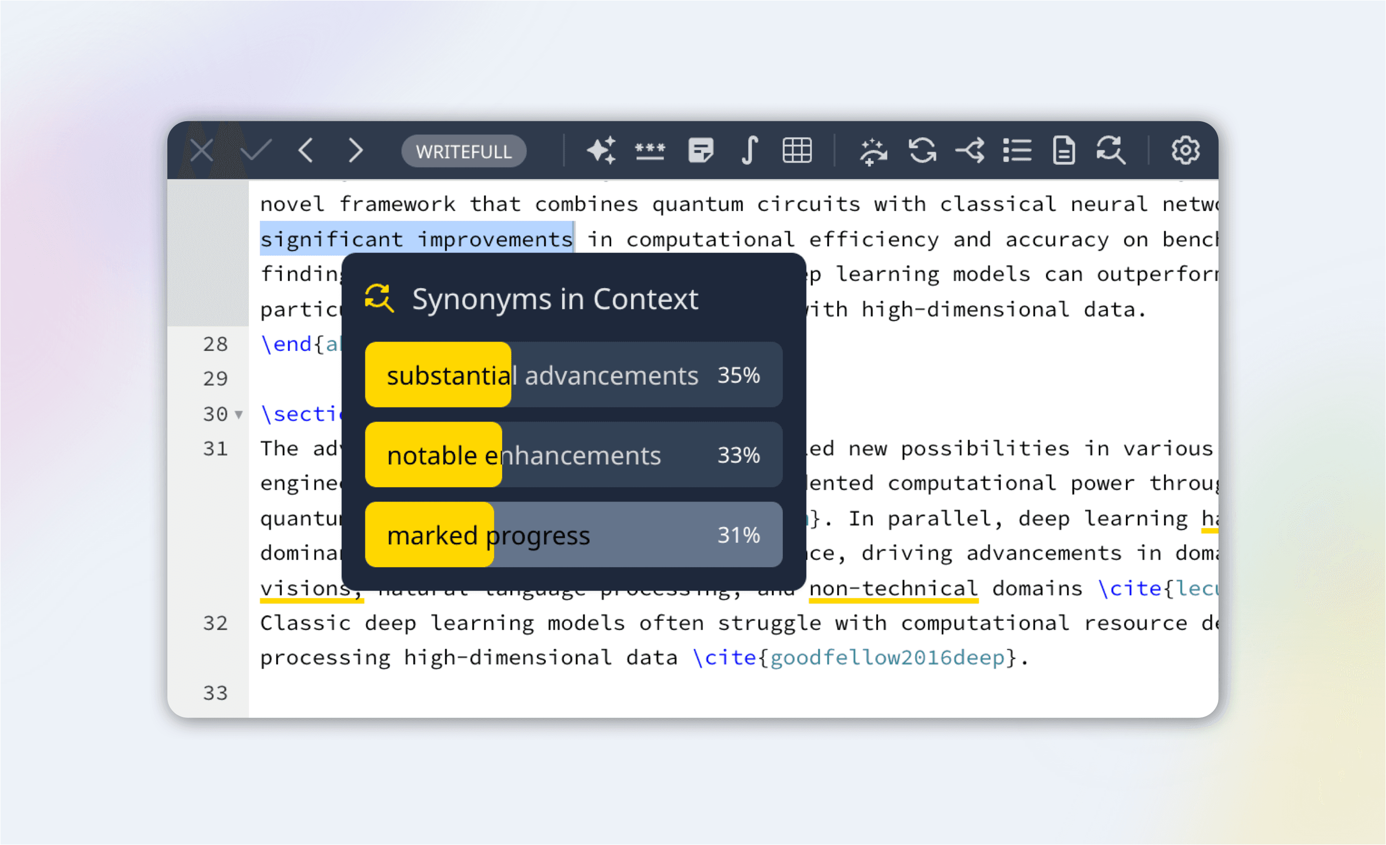 Get LaTeX-tailored language feedback and writing features within Overleaf, for even quicker writing and editing.