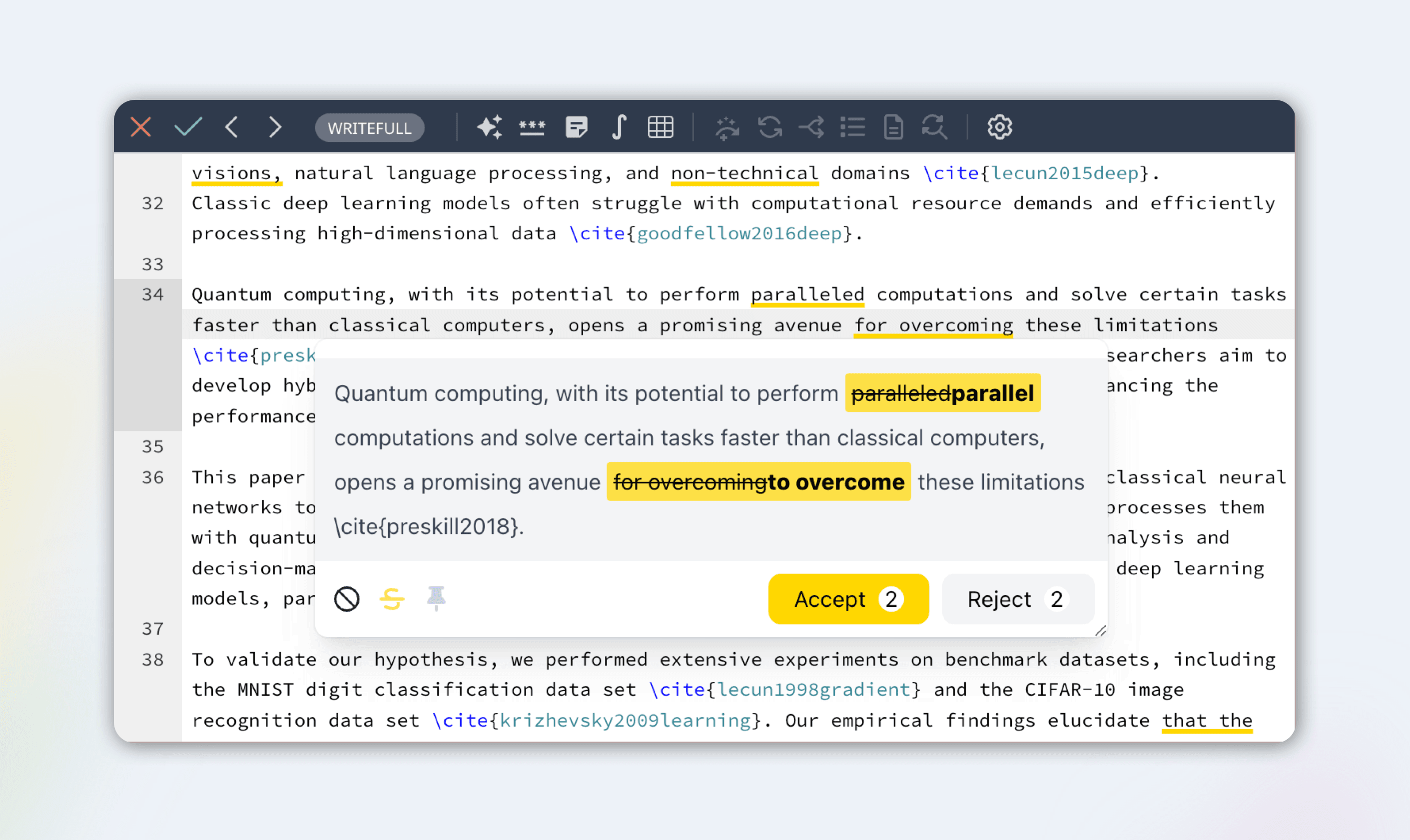 Get high-quality language feedback from Writefull's specialized models, which have been trained on published papers and customized for LaTeX. Writefull does not store or train on your texts.