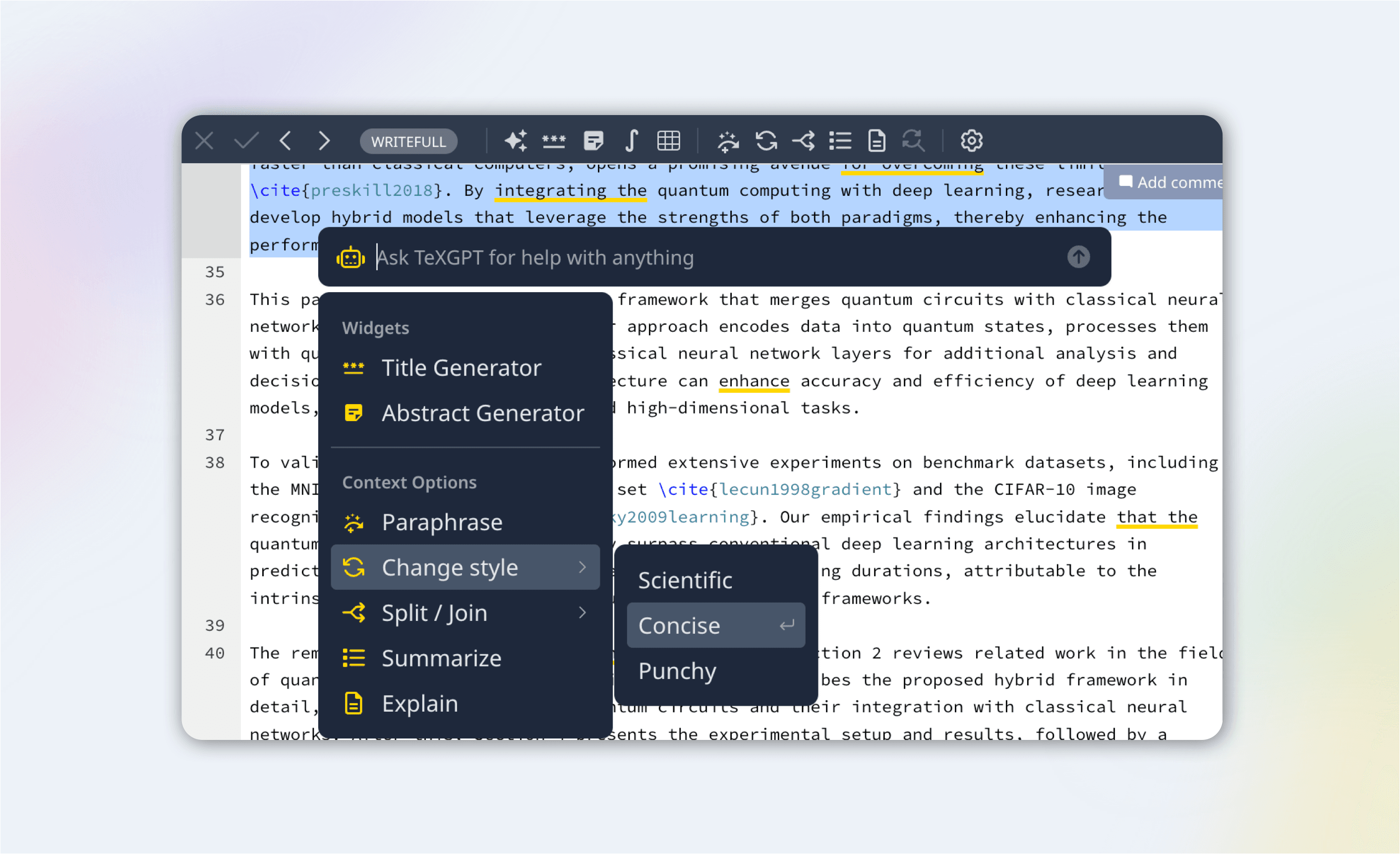 Select any part of your text and choose one of Writefull's AI context options--from paraphrasing to summarizing.