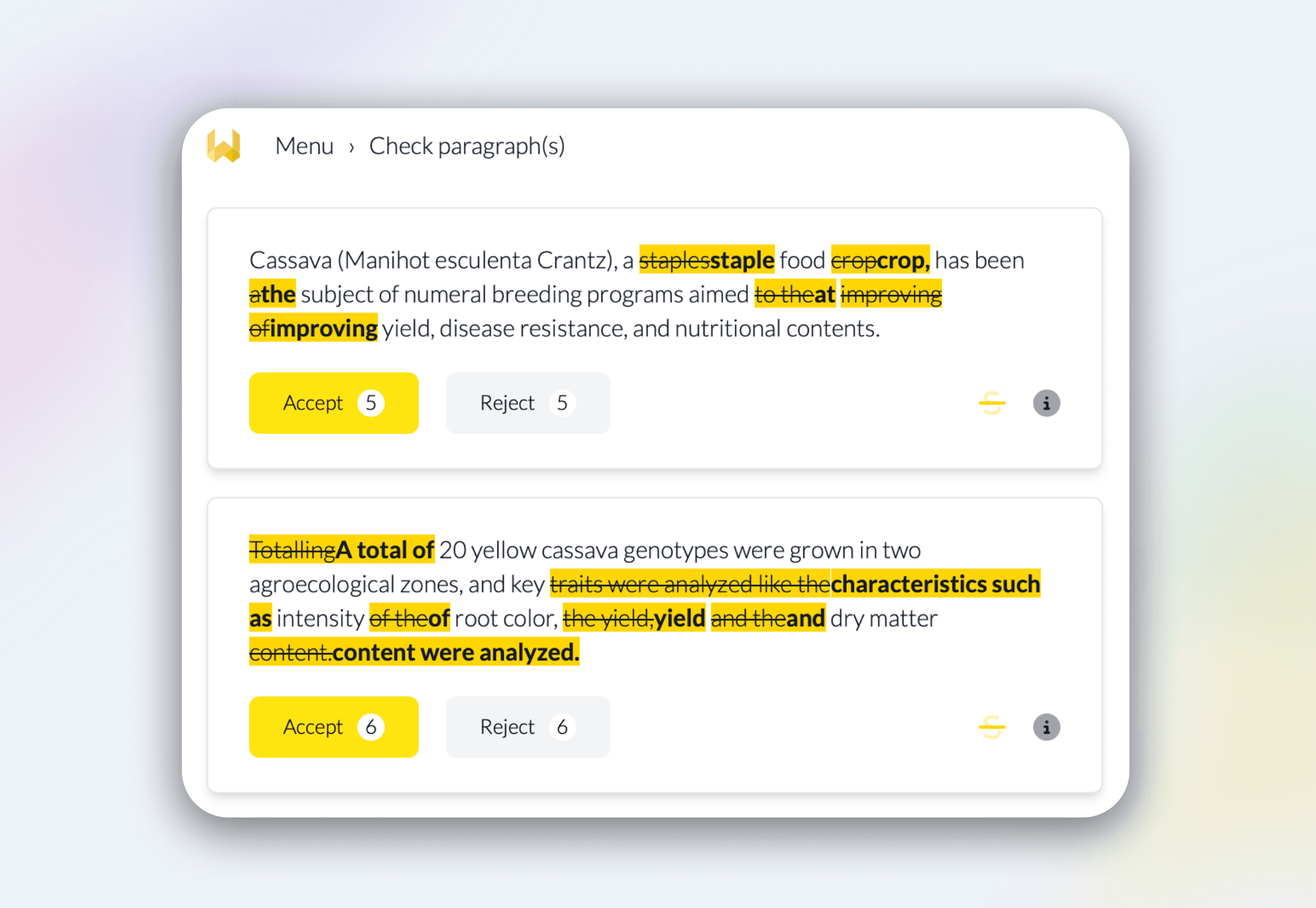 Perfect your grammar, word use, and more with edits tailored to academic writing.